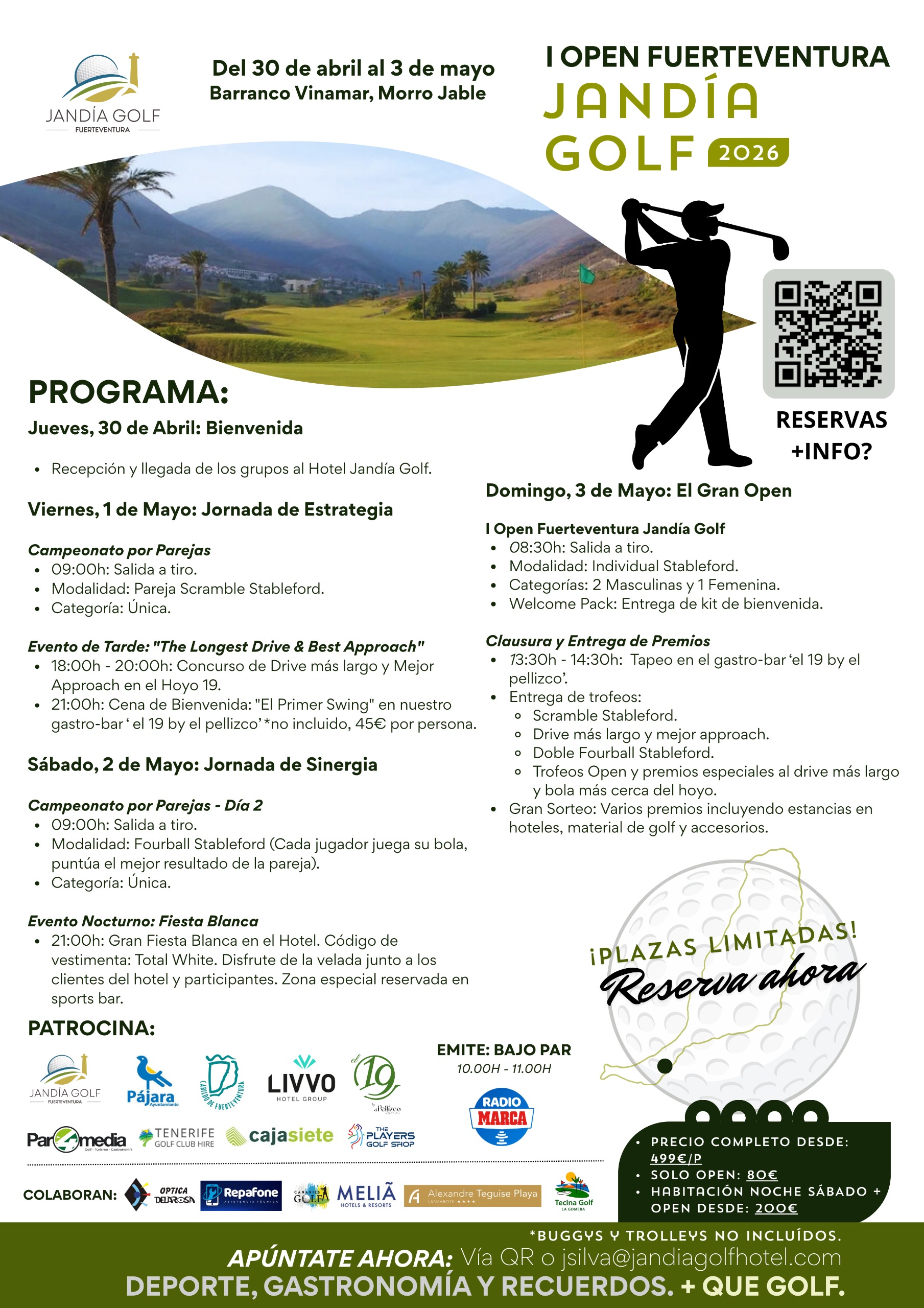 El domingo llega el plato fuerte: el I Open Fuerteventura Jandía Golf. Salida a tiro a las 08:30h, modalidad individual Stableford y tres categorías (dos masculinas y una femenina). Aquí ya no hay equipo que valga. Cada uno con su tarjeta, con sus sensaciones… y con ese runrún interno que aparece cuando sabes que te estás jugando algo más. Además, todos los jugadores recibirán su welcome pack, un detalle que siempre suma.