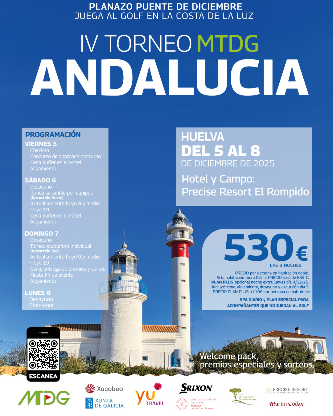 A nivel de patrocinadores y colaboradores, MTDG Andalucía 2025 cuenta con apoyos notables como Turismo de Galicia, Agencia destino Huelva, Yutravel, Srixon, Golf El Rompido y Precise Resort El Rompido o Bodegas Martín Códax que ofrecerá una degustación de sus deliciosos Alma Atlántica.